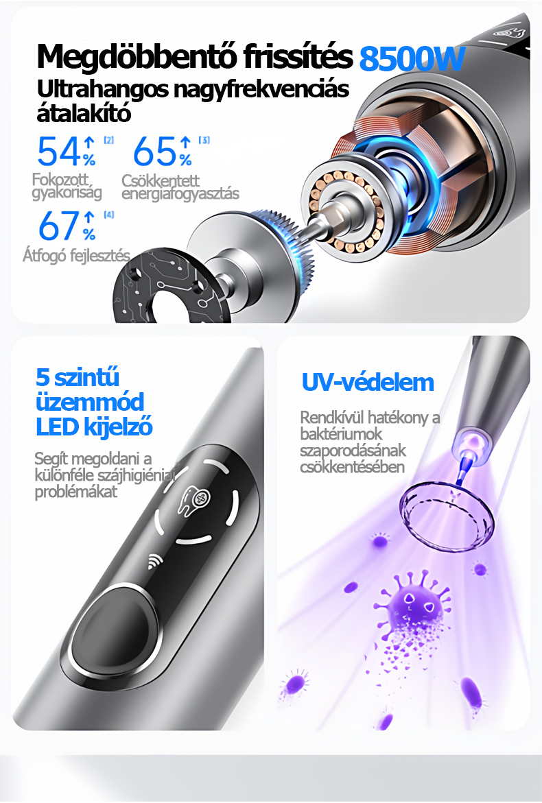 【Újdonság - T8 Ultra - Nagyfrekvenciás változat lila fénnyel】 8500 W-os nagyfrekvenciás ultrahangos hullám, kétmagos teljesítmény + lila fényvédelem + 5 sebességfokozat + 2 tisztítási tipp + 500 mAh-s ultrahosszú akkumulátor-üzemidő + professzionális fém